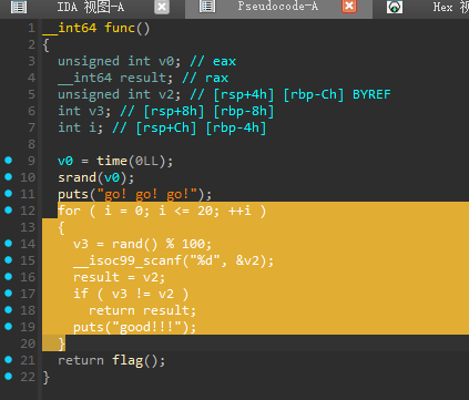 核心思想就是进入一个func函数中,连续猜对20次数字便可以进入到一个叫做flag()的函数里