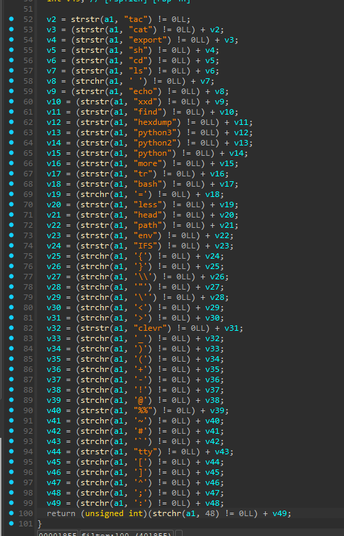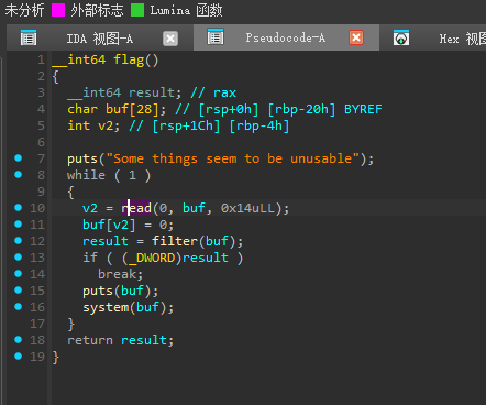 在把buf传给system之前会有一个filter函数,这个里面会用str来对比字符串,如果我输入的东西里面有什么值被程序制作着定义为“不可以输入的”那么就会直接退出程序: