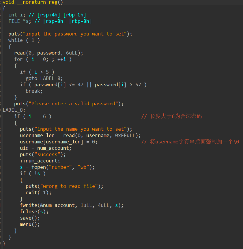 我们了解一下,后门函数的触发条件是当uid==11451419的时候,就会触发。然后通过reg函数和save函数,大概可以看出来,每次我注册的的时候,uid就会++。也就是当我注册第11451419个账户的时候,我就可以很自然的获得管理员权限。