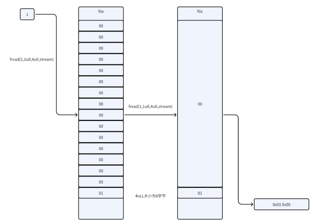 而每次塞入的长度都是什么6ull,4ull的,所以塞入的时候,值后面一定会有”\0”这种结尾符号,哪怕我存入数字1,到机器里面也是0x00000001,最后被读取出来的时候就只有0x01和0x00两个有效信息了,一个告诉我没有更多的值了(0x00的作用),还有一个告诉我值是多少(0x01的作用)如图所示: