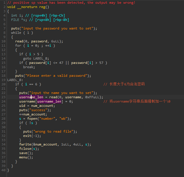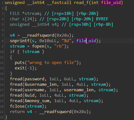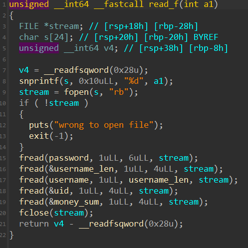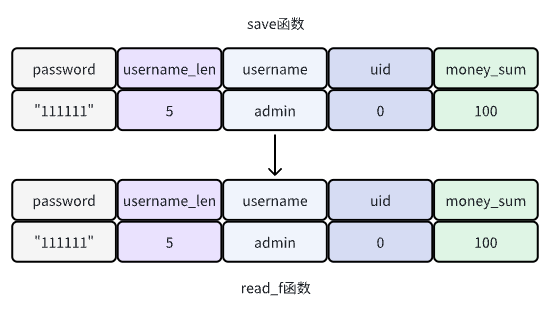 在这个read_f中,不难发现里面有一个小漏洞:读取password后,会读取username_len,而接下来的username会读取username_len个长度的内容。